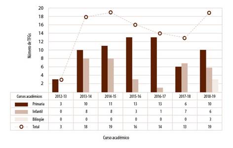 En la Figura 1 se muestra el número total de TFG defendidos en la franja cronológica elegida para el estudio, 7 cursos académicos. A excepción del curso 2012-2013, que solo cuenta con 3 trabajos en la especialidad de Educación Primaria, el resto de los cursos muestra una estabilización en torno a 17 TFG con una clara preponderancia de la especialidad de Primaria sobre Infantil. No obstante, en los cursos 2016-2017 y 2017-2018 se invierte esta tendencia con una disminución considerable de los TFG defendidos en Educación Primaria. Asimismo, conviene señalar que la especialidad Bilingüe no aparece hasta el curso 2018-2019 con tres trabajos.