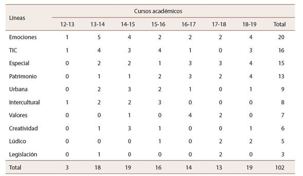 Para la elaboración de la Tabla 2 se ha utilizado este mismo código de palabras clave relacionado con los cursos académicos. La finalidad ha sido identificar las líneas que se han mantenido a lo largo del tiempo y las que han desaparecido.