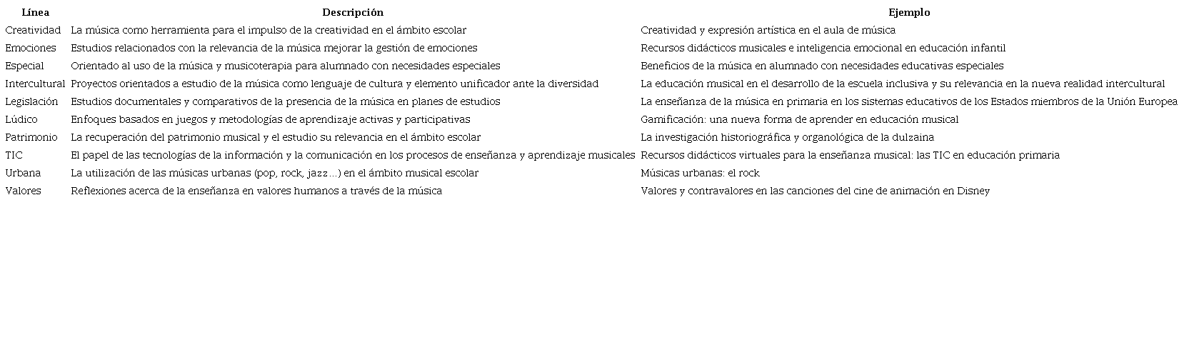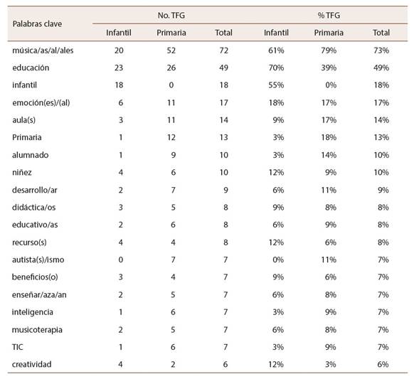 Results.: A steady continuity in the research output was observed in the overviewed period. The most researched lines included music and emotions (19.61%), music and information and communication technologies (15.69%), and music and special education (14.71%), while the least researched one was legislation on music education (2.94%). The analysis of the keywords of the titles showed a strong presence of the term emotion(s)/(al) in the bachelor’s degrees of Early Childhood and Primary Education Teaching. Some substantial differences were also found in the thematic preferences of both degrees, pointing to more theoretical and technical studies in Primary Education and more practical studies in Early Childhood.