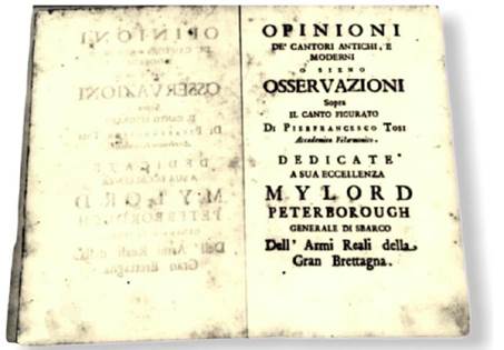 Es hasta 1723, que se tiene registro del primer tratado oficial de canto, escrito por el castrato (cantantes que eran castrados antes de la adolescencia para conservar las notas agudas en su voz) Pier Franceso Tosi (c. 1653-1732), dirigido específicamente a profesorado de canto y a cómo deben enseñar: Opinioni de’ cantori antichi, e moderni [Opiniones de los cantores antiguos y modernos] (Figura 1), traducido más tarde al inglés como Observations on the Florid Song [Observaciones sobre la canción florida] (1742). (Coffin, 2002). Este libro está pensado en la voz del castrato, muy popular en la época, desde la prohibición papal de que las mujeres cantaran en los oficios sacros de la iglesia católica. En ella, aconseja en temas tales como la importancia de aprender solfeo, la unificación de la voz de pecho y cabeza, la ejecución de la messa di voce (Técnica que consiste en iniciar muy bajo de volumen, aumentarlo paulatinamente y volverlo a disminuir) y otros.