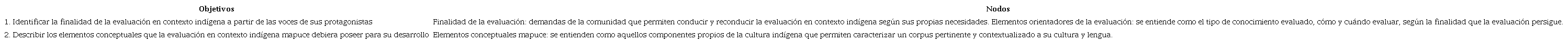 Coherente al enfoque asumido, se conformó una comunidad de investigación (CI), compuesta por profesorado mapuce (3 hombres y 2 mujeres), 6 estudiantes de pregrado (5 mujeres y 1 hombre), 9 estudiantes (4 niñas y 5 niños), 2 académicos de la ciudad de Santiago y 1 académico de la ciudad de Temuco, esto es, un total de 23 participantes. La CI decidió el problema a investigar y generar nodos orientadores que permitieran profundizar en la temática de estudio y así responder a los objetivos propuestos (ver Tabla 1).