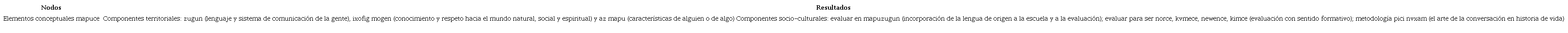 En términos generales, los resultados permiten describir dos componentes como elementos conceptuales de una evaluación en contexto indígena: componente territorial y el componente socio-cultural (ver Tabla 3).