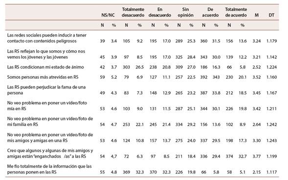 Results: The result shows that addiction and deception are the issues of greater concern. Furthermore, there are significant differences between the participants: women are more aware of the risks, and men, with a low academic performance profile, are more daring and feel more conditioned in their mood depending on the social media they use.