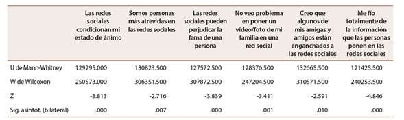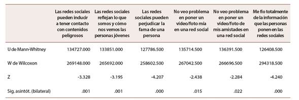 En relación con el sexo, como se puede observar en la Tabla 2, se han encontrado diferencias estadísticamente significativas en las chicas, frente a los chicos, quienes han obtenido rangos promedio más elevados, a excepción de la variable me fio totalmente de la información que las personas ponen en redes sociales, donde son los varones quienes están más de acuerdo con esta afirmación que las mujeres.