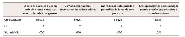Según la tipología de centro (público, privado y concertado), la prueba Kruskal-Wallis ha identificado diferencias estadísticamente significativas en las siguientes variables (Tabla 4). En concreto, es el estudiantado perteneciente a centros privados y concertados los que en mayor medida (frente al alumnado de centros públicos), consideran que las redes sociales pueden inducir a tener contacto con contenidos peligrosos. También consideran que son más atrevidos o atrevidas en las redes sociales, que estas pueden perjudicar la fama de una persona y que piensan que hay amigas y amigos enganchados a las redes sociales.