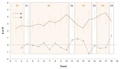 The hypothesis of this study is that the value of Ψ has low variability although the level of boredom (A) does not. In other words, it is postulated that, although the perception of boredom according to the scale used is a function of the individual, the effect on boredom of a given event is independent of who perceives it. This behavior is verified in data presented in Figure 1, which are the result of applying the proposed scale to a population of 23 students during a class divided into 18 events. Figure 1 shows how the level of boredom has inter-student variability that exceeds inter-event variation. That is, noise due to the subjectivity of perception is greater than the variation due to events. However, the variability of the impact index is much lower than its inter-event variation. In short, the group of students perceives the level of boredom with very different values of A, but there is consensus regarding the change in the level of boredom produced by an event (Ψ): most seem to become bored or discouraged in a similar way for each event.