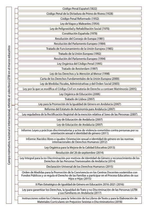 A modo de síntesis y desde una perspectiva cronológica, se expone la siguiente figura, en la cual se recoge todo el campo normativo, nacional e internacional, referido al colectivo LGTBI en el marco educativo (ver Figura 1).