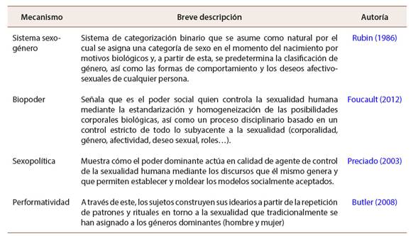Tales formas de sexualidad imperantes han actuado de manera sistémica a través de diferentes mecanismos, conformándose como los dispositivos restrictivos que han constituido los márgenes de la sexualidad (ver Tabla 1).