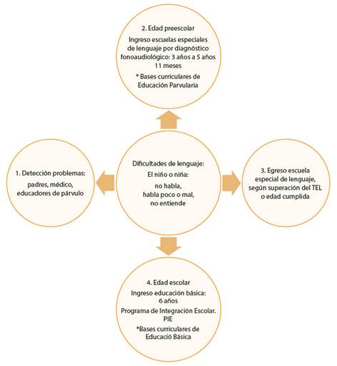 Para tener una mayor comprensión del recorrido que hace un niño o niña que presenta TEL en el sistema educacional nacional de Chile, se presenta la Figura 1, que muestra una síntesis de la trayectoria escolar de atención del TEL en Chile: detección de dificultades de lenguaje, ingreso a escuela de lenguaje en el nivel preescolar, egreso de la escuela de lenguaje e ingreso a educación general básica.