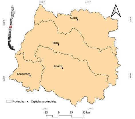 Este estudio es de carácter cuantitativo y exploratorio. Se realizó en la región del Maule-Chile, que comprende las provincias de Talca, Curicó, Linares y Cauquenes (Figura 2), con una superficie total de 30.296.10 km2, que representa el 4,0% de la superficie nacional, excluyendo el Territorio Chileno Antártico. Según el censo del año 2017, alcanza una población de 1.044.950 habitantes y una densidad de 34,49 habitantes por kilómetro cuadrado (Biblioteca del Congreso Nacional de Chile [BCN], 2018, 2002).