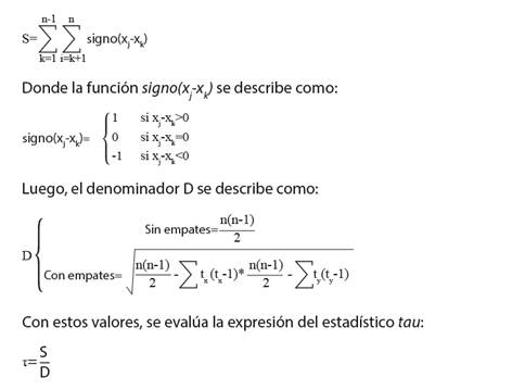 La prueba de Mann-Kendall verifica la existencia de tendencias en series de datos temporales. Esta técnica se utiliza ampliamente en estudios hidroclimatológicos (e.g. Burn y Hag-Elnur, 2022; Hu et al., 2020; Sangüesa et al., 2018), derivado de que es una prueba no paramétrica (Yue et al., 2002). La hipótesis nula (H0) de la prueba señala que los datos son independientes y su organización es aleatoria (Hamed y Ramachandra, 1998). Además, Yue et al. (2002) señalan que, si el tamaño de la muestra es superior a 8, la distribución del estadístico S de Kendall se aproxima a una distribución normal. Este estadístico se utiliza para obtener el estadístico tau (τ), que identifica el sentido de la tendencia (negativa, positiva o sin tendencia). A continuación, se presentan las fórmulas empleadas para calcular los estadísticos (Figura 3):