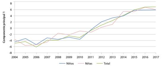 En la Figura 4 se presenta el comportamiento del componente principal 1 en el tiempo, donde se aprecia una tendencia positiva de la matrícula de los niños y niñas con diagnóstico de TEL. Esto significa que a lo largo de 14 años se ha ido incrementando la matrícula, manteniéndose una tendencia al alza.
