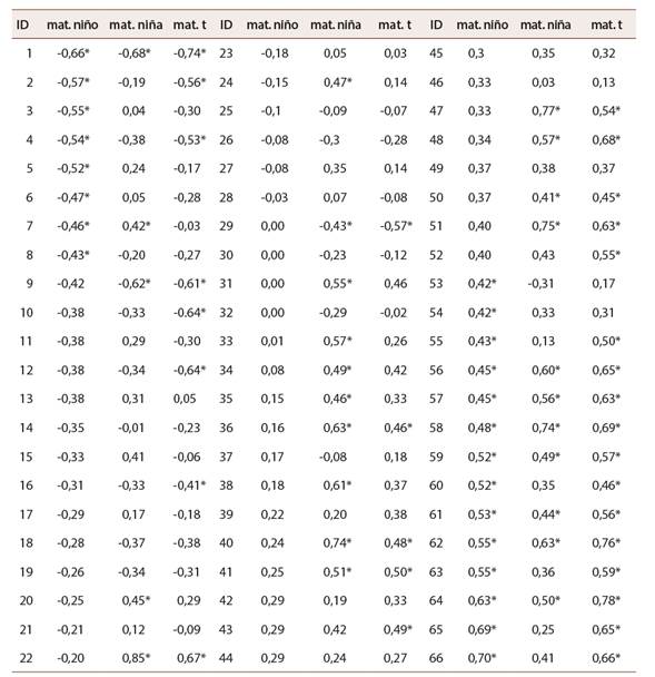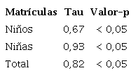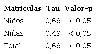 Finalmente, para verificar la significancia de la tendencia, se contrasta el estadístico obtenido con los valores tabulados de la tabla de Kendall. Para el análisis de datos se consideró las matrículas por género y el total de matrículas (suma de matrículas de niños y niñas). A cada serie de datos y para cada escuela, se aplicó el estadístico tau de la prueba de Mann-Kendall. El tau se utilizó en este estudio para correlacionar la matrícula por año (niños, niñas y total) y el tiempo en años transcurridos, visualizando la fuerza de relación de estas variables. Al contemplar las 66 Escuelas Especiales de Lenguaje, se genera un total de 198 relaciones estadísticas expresadas en el valor tau, que es una expresión de correlación que entrega valores entre -1 y 1. El valor más cercano a 1 presenta una relación fuerte y directa, es decir, a mayor tiempo transcurrido la matrícula aumenta; mientras más cercano sea el valor a -1, se presenta una relación fuerte pero inversa, es decir, a mayor tiempo transcurrido la matrícula decrece.