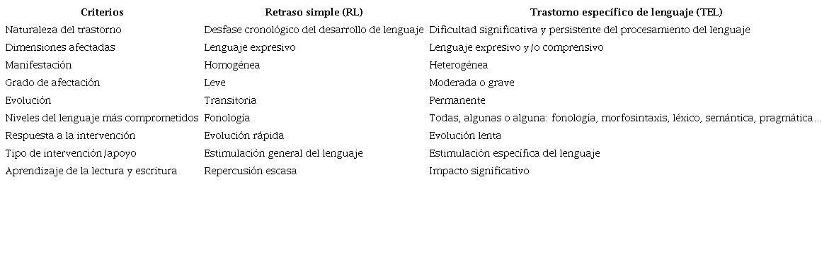 En términos sinópticos se hace un paralelo entre RL y TEL en la Tabla 1, donde se abordan criterios de naturaleza del trastorno, dimensiones afectadas, manifestación, grado de afectación, evolución, niveles del lenguaje más comprometidos, respuesta a la intervención, tipo de intervención/apoyo y aprendizaje de lectura y escritura.