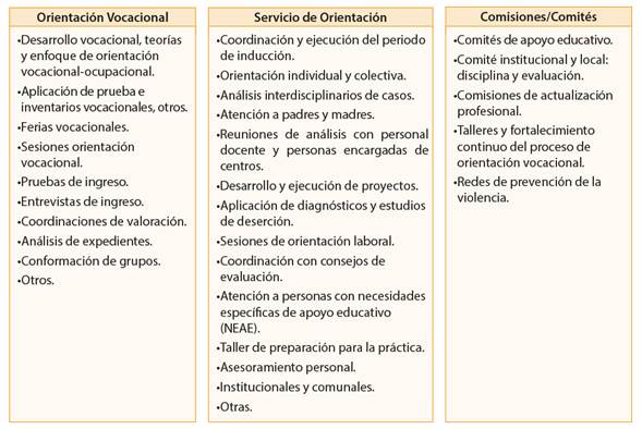 Considerando lo anterior, el colectivo profesional en orientación realiza su mediación desde la orientación vocacional, la cual se encuentra organizada por una serie de fases integradas en una sucesión de acciones, dentro del orden vocacional, de acompañamiento en mejora del bienestar estudiantil y participación de diversos comités (INA, 2018c).
