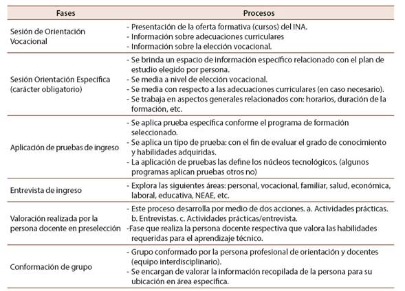 Paralelamente, las personas informantes manifiestan claridad en las otras fases de dicho proceso, a saber, la entrevista de ingreso “hicimos más de dos mil entrevistas de ingreso” (Participante 1); y “la valoración realizada por la persona docente” (Participante 4); “organizamos entrevistas, acciones prácticas o mixtas, con el docente de especialidad donde se valora las habilidades de la persona para su aprendizaje técnico” (Participante 2) y; la conformación de grupos, en equipo “con los docentes conformamos los grupos de las personas con relación a la información obtenida” (Participante 3).