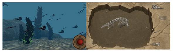 El jugador o la jugadora debe ir aumentando sus páginas del diario e ir formándose como paleontólogo o paleontóloga. Para ello, puede consultar continuamente la ayuda del videojuego y también revisar las páginas del diario que logra en cada fase. Para ir obteniendo puntos y superar el juego se alternan fases de realidad aumentada -con la mecánica del Escenario 360 grados, o vídeo inmersivo, de realidad virtual (Figura 2) en el cual el público usuario puede navegar utilizando un “joystick” electrónico que aparece en la pantalla -con otras fases de pruebas de puzles- donde se deben concluir reconstrucciones de diversos objetos, fósiles y esqueletos (Figura 2).