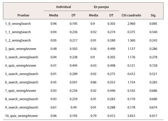 No existen diferencias significativas entre los grupos de la muestra sobre la variable exactitud total del juego. No obstante, cuando analizamos por separado cada una de las mecánicas (Tabla 1) obtenemos que sí existe una diferencia significativa en lo referente a la exactitud en la última fase. Esta se presenta en una pregunta de Quiz y el análisis de los datos que muestra una diferencia significativa en el acierto al responder dicho cuestionario. La diferencia significativa es de χ² (1gl n=159) = 5,653 p= 0,017 y coeficiente de contingencia C=0,185 p=0,017, a favor de la niñez que juega en pareja.