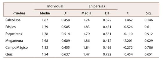 Como podemos observar, la última mecánica es la que muestra mayores diferencias. Dicha prueba es la que menos gusta, de forma general, a la niñez ya jueguen individualmente o en grupo. Cuando realizamos una t de Student para comparar la media entre quienes se enfrentan a las pruebas de manera individual y quienes lo hacen en parejas, una de las mecánicas muestra diferencias significativas(Tabla 2). La Meganeura recibe mejor acogida entre las personas que juegan de manera individual al juego (N=156; t= -2,201; p<0,05).