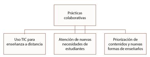Durante la crisis se desarrollaron prácticas de colaboración docente, nuevas o renovadas, que se vincularon, como muestra la Figura 1, con cambios en los modos de enseñanza que debió implementar el profesorado.
