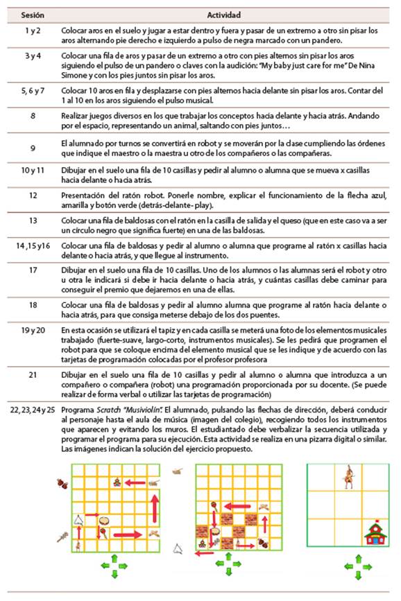 El programa de actividades consta de 25 sesiones con una duración de 55 minutos cada una con la finalidad de introducir el lenguaje computacional a través de actividades en las que paralelamente se desarrollen los contenidos y actividades musicales seleccionados para esta etapa. En la Tabla 1 se muestran las 25 sesiones de las que consta el programa, y el cual se puede dividir en tres bloques a través de los cuales el niño y la niña irá adquiriendo las habilidades, destrezas y conocimientos para transferirlos al lenguaje computacional y, a posteriori, en actividades de programación. De este modo, el primer bloque (sesiones 1- 11), lo constituyen actividades en las que se desarrollan habilidades de orientación espacial, psicomotricidad gruesa, control postural, y control de las extremidades inferiores. Seguidamente, en el segundo bloque (sesiones 12-21) se disponen las actividades en las que el estudiantado debe realizar órdenes a modo de comandos, realizadas, bien por sus pares, bien por el maestro o maestra, así se desarrollan destrezas de organización y programación para la resolución de problemas planteados. Estas actividades están dentro del pensamiento computacional desenchufado (computational thinking unplugged), donde las actividades elaboradas se desarrollan con los materiales específicos del aula y con el propio cuerpo. El tercer bloque (sesiones 22-25) corresponde a las actividades en las que se transfieren los conocimientos computacionales adquiridos a través de la manipulación y experimentación al programa de programación Scratch. Este programa, a través de las diferentes combinaciones de las acciones y los comportamientos que ofrece, y a modo de puzle, consigue que los objetos realicen una u otra reacción.