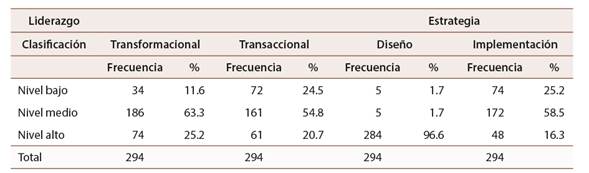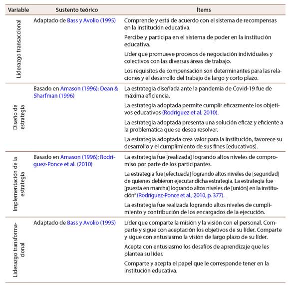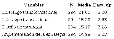 Para efectos de la presente investigación se utilizaron las siguientes variables: estilo de liderazgo transformacional, estilo de liderazgo transaccional y el diseño e implementación de la estrategia (Tabla 1).