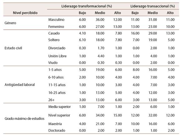En la Tabla 4 se observan las características sociodemográficas, la antigüedad y el nivel de estudio con los estilos de liderazgo transformacional y transaccional. En lo referente al género masculino y femenino, ambos perciben en mayor medida el nivel medio en el liderazgo transformacional seguido del nivel alto, lo mismo ocurre para el liderazgo transaccional, es decir, el género no influye en la percepción de los niveles de liderazgo. Para el estado civil, antigüedad laboral y el grado de estudio se repiten las estadísticas, existe una tendencia a un nivel de liderazgo medio en ambos estilos, seguido de un nivel alto en menor porcentaje y, por último, se encontró el nivel bajo, por lo que al igual que el género, ninguna de estas características influye en la percepción de las personas empleadas.
