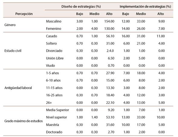 De igual manera se relacionan las características sociodemográficas, la antigüedad y el nivel de estudio con los niveles percibidos en el diseño e implementación de estrategias (Tabla 5). Se observa que para ambos géneros evaluados en el diseño de estrategia presentan en un nivel alto su mayor porcentaje, para la implementación de la estrategia el mayor porcentaje se ubica en un nivel medio, es decir, se distingue que el género no influye en los niveles de percepción del personal. Estas mismas tendencias se muestran para las demás variables sociodemográficas, ninguna de las características evaluadas influye en la percepción y clasificación que tienen las personas trabajadoras del diseño e implementación de estrategias.