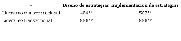 Se observa que para el liderazgo transformacional se obtuvo una correlación positiva débil de .484 con el diseño de estrategias y una correlación positiva media de .507 para la implementación de las estrategias, por otra parte, para el liderazgo transaccional se obtuvo una correlación positiva media de .539 para el diseño de estrategias y también correlación positiva media de .596 para la implementación de estrategia, todas con una correlación significativa al nivel 0,01, lo anterior se traduce a que cuando mejor se aplica el estilo de liderazgo transformacional o transaccional, la percepción en los niveles de diseño e implementación de estrategias, es mayor.