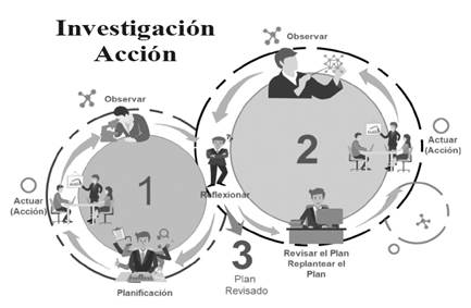 En el proceso de investigación acción (ver Figura 1) se ve el proceso de espiral en al menos dos ciclos, cada uno de ellos formato por cuatro etapas: