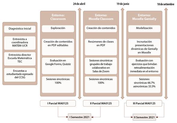 i) Etapa de planificación: Inicio a partir del interés de optimizar los tiempos de clases, se indaga sobre la estrategia didáctica aula invertida (ver Figura 2); cabe resaltar que los contenidos y actividades de los entornos virtuales, inicialmente elegidas por un cuestionario diagnóstico aplicado a la población egresada, fueron elaborados con base en las necesidades evaluativas de la asignatura. Se pretende mostrar al estudiantado tres entornos virtuales, en tres momentos distintos, demarcados por cada prueba parcial de proyecto MATEM (ver Figura 2). Previo al nuevo entorno se realizan sesiones diagnósticas en la plataforma Zoom.