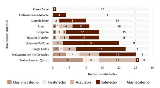 El segundo de los instrumentos fue aplicado en octubre del 2021, a la población muestra de 29 estudiantes de décimo año que ingresaron al CCSG, con el objetivo de poder valorar el proceso de los entornos virtuales ejecutados (Classroom Gmail, Moodle I semestre, Moodle-Geneally en el II semestre), valorar la pertinencia de los recursos didácticos y TIC utilizadas en escalas tipo Likert de cinco opciones (1=poco satisfecho a 5 muy satisfecho), así como el número de horas dedicadas fuera de horario regular al curso (menos de 2 horas, entre 2 y 4 horas, entre 4 a 6 horas o más de 6 horas). Una vez recogidos los datos en una hoja de cálculo y teniendo en cuenta que se aplicaron en línea, se exportaron a Excel para los análisis respectivos.