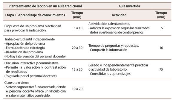 De acuerdo con la Tabla 2, la etapa 1 que se plantea está planificada para un bloque de dos lecciones de 40 minutos cada una, mientras que la estrategia de aula invertida está planteada para una sesión de trabajo de 90 minutos, lo cual aporta flexibilidad para el aprendizaje, facilita la administración del tiempo y las condiciones de estudio, modifica la manera de acercarse al conocimiento, ya sea mediante vínculos con compañeros, compañeras y personal docente o a la hora de la aplicación de los conceptos.