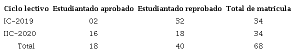 Como se observa en la Tabla 1, cada año se admiten 34 estudiantes en el curso MA0125 por semestre, este es un curso que permite generar las bases para enfrentar cálculo. Durante el 2019, la población que recibió el curso en la modalidad presencial obtuvo solo un 6% de promoción, mientras el año 2020, debido a la COVID-19, el estudiantado cursó la asignatura en la modalidad virtual con un 47% de promoción. Por otro lado, solo el 26% del estudiantado que cursó MA0125 en la UCR sede Guanacaste durante el 2019 y 2020 logró aprobar el curso (Tabla 1).