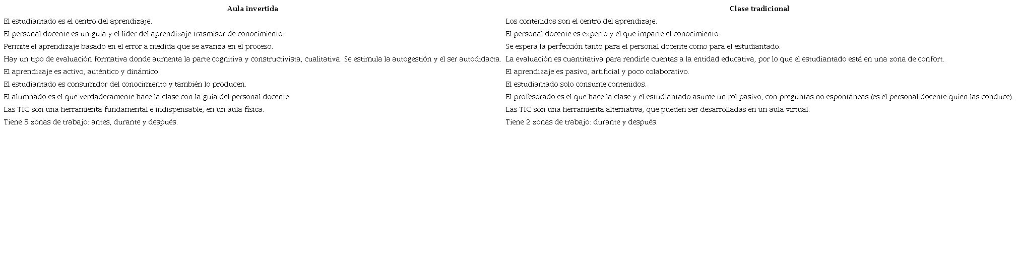 Al respecto, Vidal Ledo et al. (2016) mencionan que el aula invertida (flipped classroom) es una estrategia didáctica que abre un camino hacia el cambio el modelo tradicional de aprendizaje, pues ofrece la posibilidad de acceder a la información en tiempo real sin la presencia física del docente o la docente, lo cual implica que el estudiantado estimula el desarrollo de la habilidad de la autogestión con mayor compromiso.