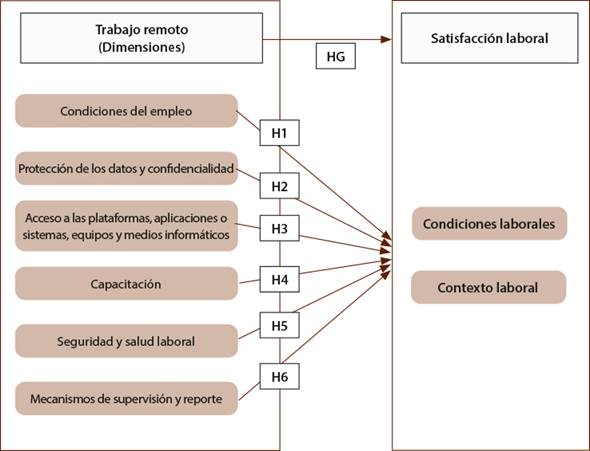 HE1: Las condiciones del empleo se relacionan significativamente con el nivel de satisfacción laboral. HE2: La protección de los datos y confidencialidad se relacionan significativamente con el nivel de satisfacción laboral. HE3: El acceso a plataformas, aplicaciones o sistemas, equipos y medios informáticos se asocia significativamente al nivel de satisfacción laboral. HE4: La capacitación se asocia significativamente al nivel de satisfacción laboral. HE5: La seguridad y salud laboral se relacionan significativamente con el nivel de satisfacción laboral. HE6: Los mecanismos de supervisión y reporte se relacionan significativamente con el nivel de satisfacción laboral. En la Figura 1 se presenta la organización de las hipótesis.