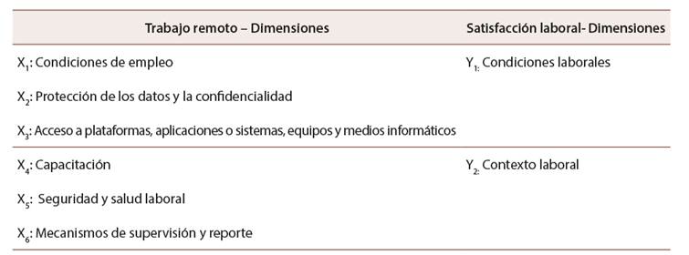 El enfoque del estudio fue cuantitativo transeccional correlacional, se determinó la relación entre la variable independiente (trabajo remoto) y la variable dependiente (satisfacción laboral) en la Tabla 1 se presenta las dimensiones de cada variable.
