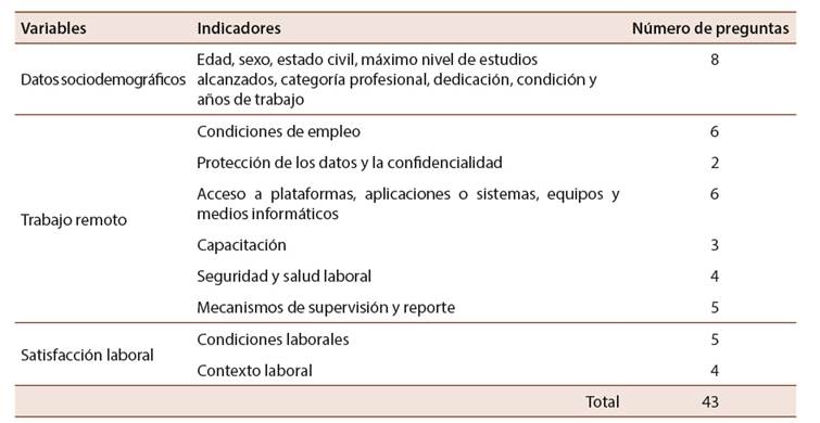 Los instrumentos que se emplearon fueron dos: el análisis documental (revisión bibliográfica) y el cuestionario autoadministrado de preguntas cerradas con la escala Likert. Se estableció un cuestionario de 43 ítems, las 8 primeras son preguntas sobre datos sociodemográficos que incluyen edad, sexo, estado civil, máximo nivel de estudios alcanzados, categoría profesional, dedicación, condición y años de trabajo. Los 35 ítems restantes fueron diseñados para trabajar con una escala Likert de cinco puntos, para la variable trabajo remoto (totalmente en desacuerdo, en desacuerdo, indiferente, de acuerdo, totalmente de acuerdo), para la variable satisfacción laboral (nada satisfecho, poco satisfecho, neutral, satisfecho, muy satisfecho). Además, el cuestionario se dividió en tres bloques de preguntas. El primero se enfocó en recoger información sociodemográfica de las personas encuestadas. El segundo, en medir las seis dimensiones de la variable trabajo remoto. El tercer bloque se enfocó en medir las dimensiones de la variable satisfacción laboral. En la Tabla 2 se presenta la cantidad de preguntas por dimensión.