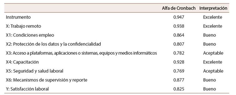 Un coeficiente alfa de Cronbach de 0,947 para un instrumento que evalúa la relación entre trabajo remoto y satisfacción laboral indica una alta consistencia interna entre las preguntas utilizadas en el instrumento. Esto sugiere que las preguntas del instrumento están estrechamente relacionadas y miden de manera fiable el constructo que pretenden evaluar, lo que aumenta la confianza en la validez de los resultados obtenidos.