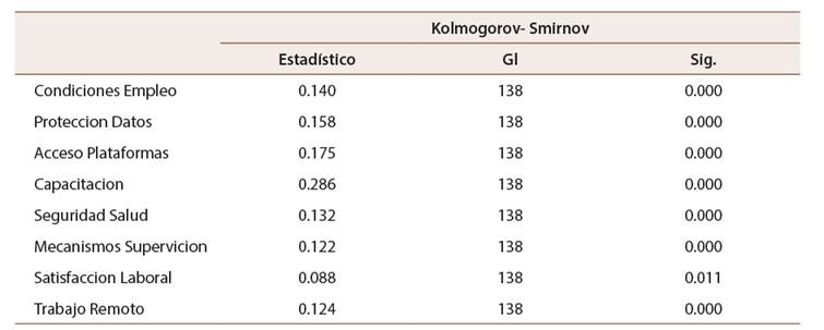 El análisis de los datos se puede realizar a través de diferentes coeficientes de correlación, la elección del coeficiente depende de la prueba de normalidad y de las características de las variables. Se definió las hipótesis para realizar la prueba de normalidad para cada una de las variables y para sus respectivas dimensiones Ho: Los datos provienen de una distribución normal (hipótesis nula), Ha: Los datos no provienen de una distribución normal (hipótesis alterna), como la cantidad de datos es mayor a 50 entonces se empleó la prueba de normalidad Kolmogorov-Smirnov, en la Tabla 4 se muestran los resultados para la prueba de normalidad tanto para las variables como para sus dimensiones.