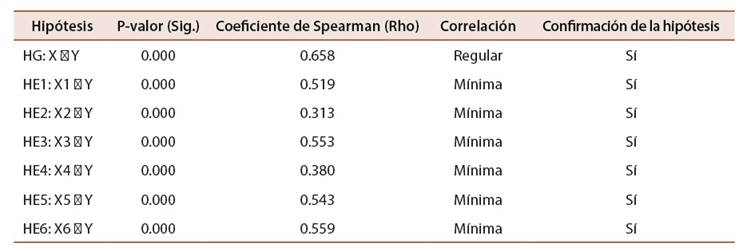 En la investigación, las hipótesis son correlacionales, en las que se establecen vínculos entre dos o más variables. Para analizar la correlación de las variables, se empleó el coeficiente de Spearman (rho), el cual suele emplearse para analizar la relación de las variables ordinales con escala tipo Likert. Las hipótesis del estudio son además las hipótesis alternas, complementarias a estas se definieron las hipótesis nulas. En la Tabla 5 se muestra el consolidado de los resultados del análisis de correlación aplicado a la hipótesis general e hipótesis específicas.