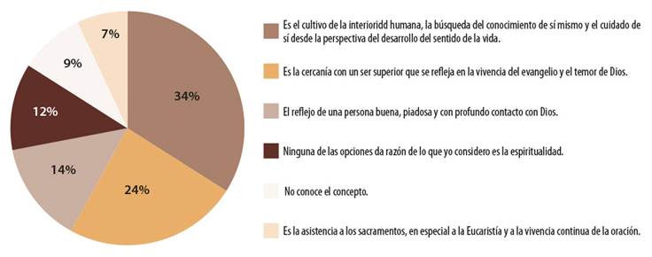 Ante la pregunta ¿cuál es su percepción sobre la espiritualidad? (Figura 1) se brindó al estudiantado seis opciones, compuesta por definiciones diversas de espiritualidad. La respuesta que tuvo mayor acogida es la que entiende la espiritualidad desde una perspectiva amplia, plural y contemporánea, en cuanto cultivo de la interioridad humana, la búsqueda del conocimiento de sí mismo y el cuidado de sí desde la perspectiva del desarrollo del sentido de la vida (Naranjo Higuera & Moncada Guzmán, 2019), con un 34,2%. Asimismo, el 13,5% concibe la espiritualidad desde una perspectiva teísta amplia: el reflejo de una persona buena, piadosa y con profundo contacto con Dios. La definición que se vincula con la tradición cristiana fue la que tuvo el segundo porcentaje más alto con un 24,2%: la cercanía con un ser superior que se refleja en la vivencia del evangelio y el temor de Dios. La respuesta con menor acogida es la que vincula la espiritualidad con expresiones de la vida católica, con un 7,4%: la asistencia a los sacramentos, en especial la Eucaristía y a la vivencia de la oración continua. De otra parte, el 8,9% expresó no conocer el concepto y el 11,5% concibe que ninguna de las opciones da razón lo que yo considero es la espiritualidad. La tendencia en los resultados deriva una conclusión primaria respecto de la espiritualidad, desvinculando en su expresión a las prácticas religiosas tradicionales e institucionales. Así, teniendo en cuenta la tendencia de mayor porcentaje sobre la percepción de la espiritualidad en el estudiantado encuestado, se abre una condición de posibilidad para reconfigurar las competencias y las estructuras curriculares que orientan la educación religiosa escolar, en respuesta a las nuevas búsquedas y necesidades formativas del estudiantado.