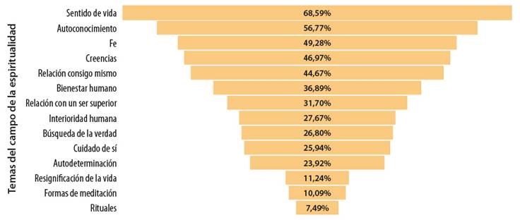 También se preguntó al estudiantado que indicara qué temas han sido abordados en el campo de la espiritualidad en sus clases de educación religiosa escolar, brindando un listado en el que podían escoger distintas opciones simultáneas (Figura 2). De las 14 opciones temáticas se destaca que 238 estudiantes eligieron el sentido de vida con un 68%. Con un porcentaje igualmente alto el 56,7% eligió el autoconocimiento, seguido de la fe con un 49,2%, las creencias con un 46,9%, la relación consigo mismo con un 44,6%. Con un porcentaje intermedio se destaca el bienestar humano con un 36,8%, la relación con un ser superior con un 31,7%, la interioridad humana con un 27,6%, la búsqueda de la verdad con un 26,8%, el cuidado de sí con un 25,9% y autodeterminación con un 23,9%. Y las respuestas con porcentajes más bajos son resignificación de la vida con un 11,4%, las formas de meditación con un 10% y rituales con un 7,4%.