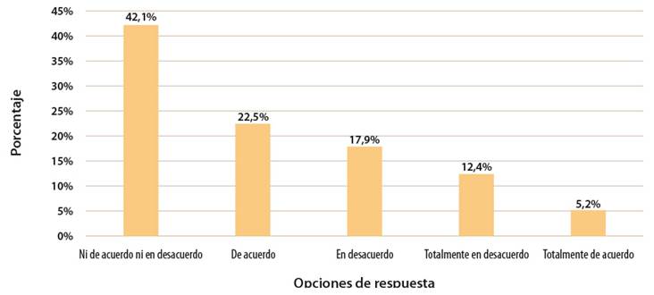 Del mismo modo, se formularon dos preguntas que cuestionan algunos imaginarios sobre la educación religiosa escolar (ERE). Concretamente se preguntó al estudiantado si creían que la clase de educación religiosa escolar podía hacer que el estudiantado sea más cercano a la creencia en un ser superior (Figura 3). El 27% se expresó de acuerdo o totalmente de acuerdo, el 30% está en desacuerdo o totalmente en desacuerdo, mientras que el 42% no se encuentra ni de acuerdo ni en desacuerdo. En consecuencia, se infiere una dispersión en los resultados, advirtiendo, con ello, que los procesos de enseñanza de la educación religiosa no necesariamente favorecen una adhesión con lo trascendente.