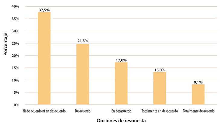 Y cuando se les preguntó si creían que la clase de educación religiosa escolar aporta en algún sentido a quien no cree en un ser superior (Figura 4), el 32% se mostró de acuerdo o totalmente de acuerdo, el 29% se mostró en desacuerdo o totalmente en desacuerdo, y el 37% ni de acuerdo ni en desacuerdo. Este tipo de respuestas refleja que, para la mayoría del estudiantado, la ERE no necesariamente hace que el estudiantado crea en un ser superior y no hay una alta valoración de lo que esta clase pueda aportar a quien no cree en un ser superior.