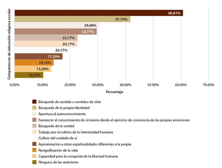 Finalmente, se presentaron 11 competencias y se les preguntó cuáles se desarrollan en sus clases de Educación Religiosa Escolar, en el marco de la formación de la espiritualidad (Figura 5). La búsqueda de sentido o sentidos de vida con 211 respuestas se configura como la más elegida con un 60,8%, seguida de búsqueda de la propia identidad con 41,7%, apertura al conocimiento con un 30,5%, favorecer el conocimiento de sí mismo desde el ejercicio de conciencia de las propias emociones con un 29,6%, búsqueda de la verdad y trabajo por el cultivo de la interioridad humana, con 22,7% cada una. El cultivo del cuidado de sí obtuvo 20,1%, aproximación a otras espiritualidades diferentes a la propia con 17,2%, resignificación de la vida con 14,1%, capacidad para la conquista de la libertad humana con 13,2% y el 10,3% considera que ninguna de las anteriores competencias se desarrolla en sus clases de ERE.