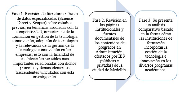 Este estudio es de tipo exploratorio-descriptivo, con el fin de identificar las tendencias y contenidos en gestión de la tecnología e innovación, dictados en las mallas curriculares de los programas de administración de la ciudad de Medellín. La investigación se lleva a cabo en tres fases, como se muestra en la figura 1:
