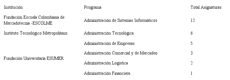 En el análisis de los datos recolectados, se identificaron las IES que ofrecen formación en administración en la ciudad, con los programas y las asignaturas respectivas. Se organiza la información obtenida, teniendo en cuenta las variables asociadas con la investigación (instituciones de educación superior, currículos, programas y asignaturas).