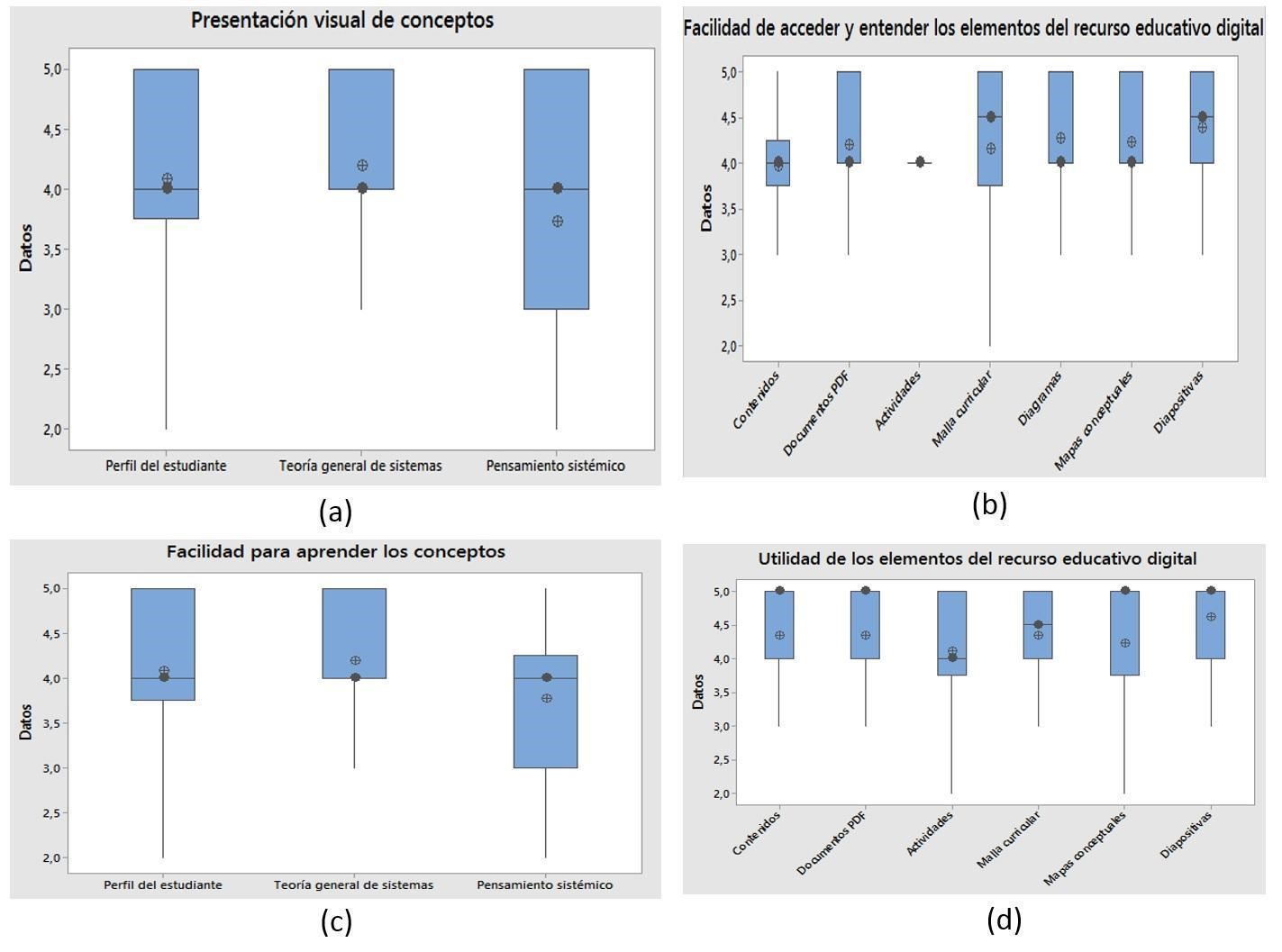 Con respecto a la facilidad de acceso y entendimiento de los elementos del RED digital (Figura 5b) también fueron evaluados muy favorablemente, con promedios superiores a 4.0. La malla curricular y las diapositivas fueron los elementos mejor valorados. Elementos como documentos, diagramas y mapas conceptuales fueron evaluados en forma muy similar, favorablemente. Sin embargo, los contenidos y la malla curricular presentan una amplia dispersión; se considera que este resultado se da porque es un documento con información densa que requiere una mejor forma de consulta que facilite su entendimiento. Algunos contenidos requieren de un mayor orden para que los conceptos se presenten de una forma clara y más accesible.