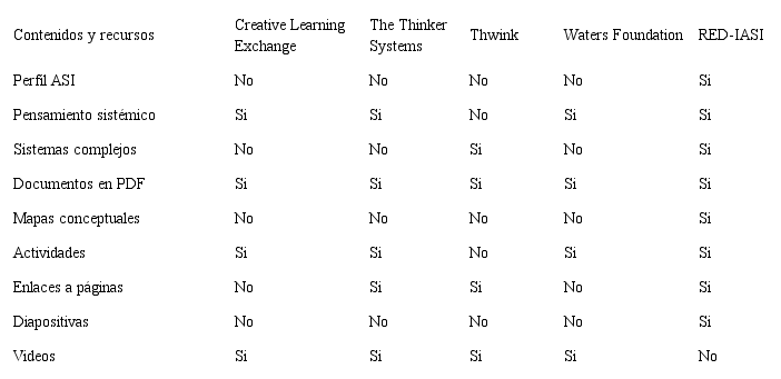 Con respecto a los contenidos, las herramientas incorporan conceptos de pensamiento sistémico o sistemas complejos. Sin embargo, ninguna herramienta incluye conocimientos sobre administración de sistemas informáticos. Por otro lado, el RED desarrollado incluye variedad de recursos para presentar sus conceptos, como documentos PDF, mapas conceptuales, actividades, enlaces, diapositivas y videos. La mayoría de las herramientas analizadas incluyen, a lo máximo, tres de dichos recursos. Se propone considerar en una etapa posterior de desarrollo y aplicación del RED, la utilización de las herramientas con las cuales se comparó el contenido del recurso, de tal manera que se puedan también establecer relaciones de tipo práctico entre ellos.